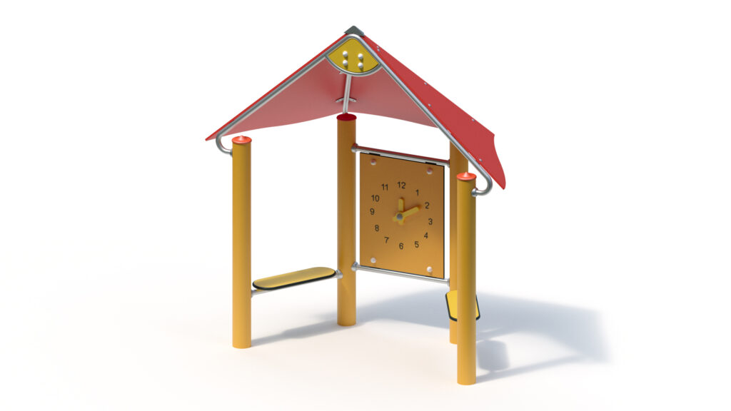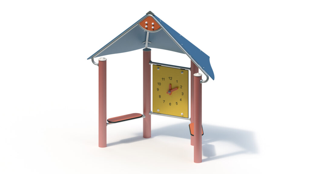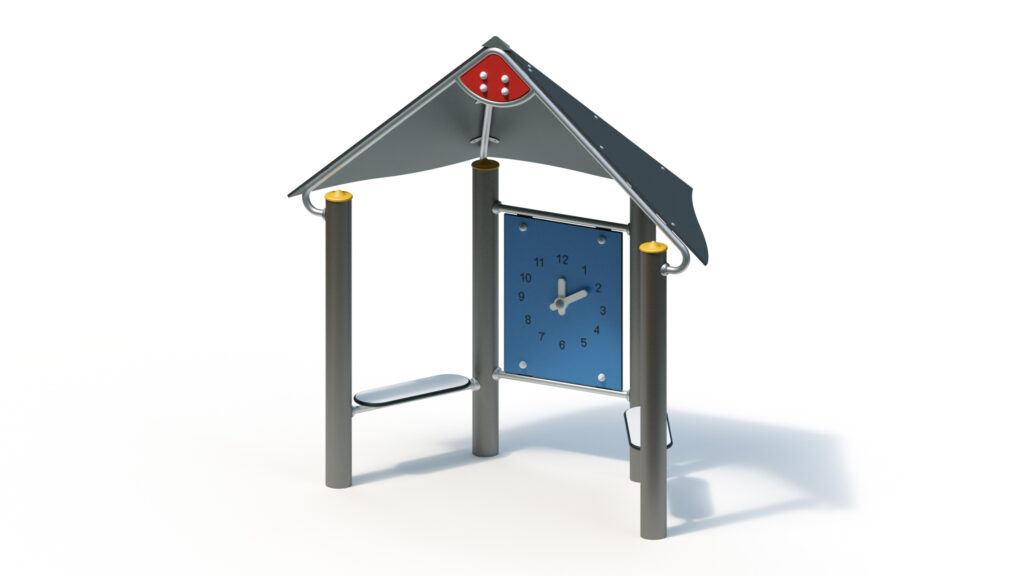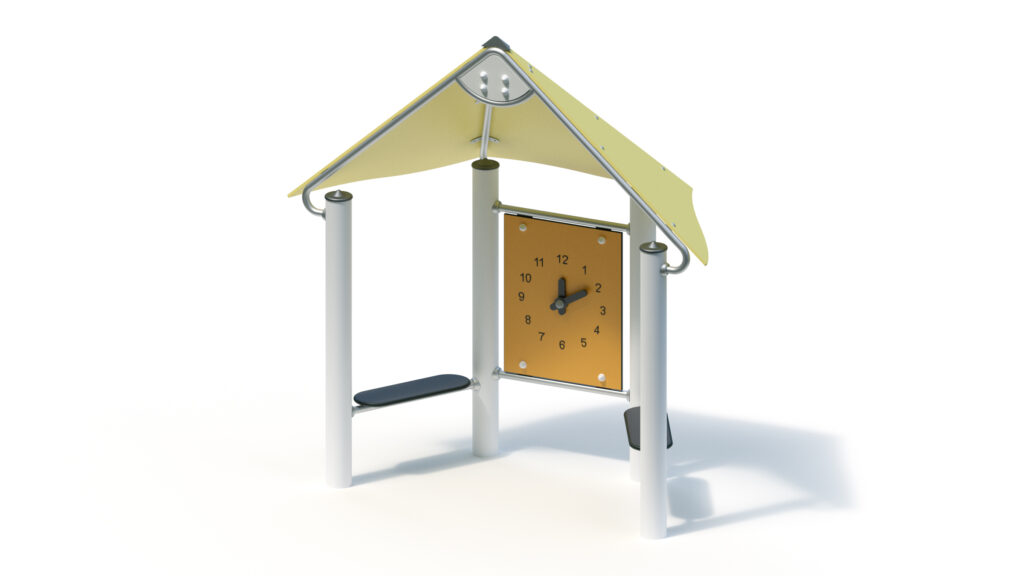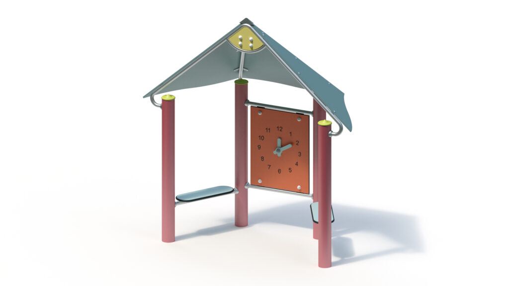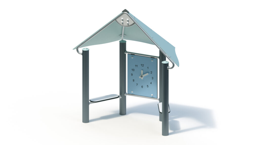 – Plattenbrüstung aus farbiger, höchst witterungsbeständiger HPL-Schichtstoffplatte (rot und gelb). Befestigung zwischen Edelstahlrohren Ø 33,7 x 2 mm. Frontplatte mit Uhr, Zeiger aus HPL-Schichtstoffplatte, blau, zum manuellen Einstellen der Uhrzeit.