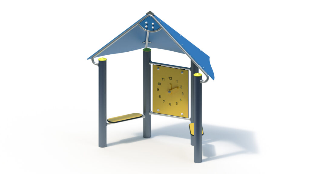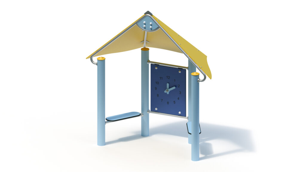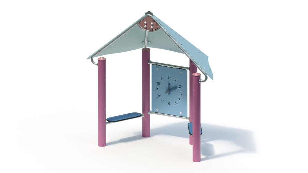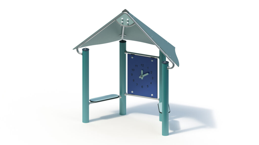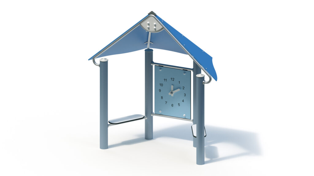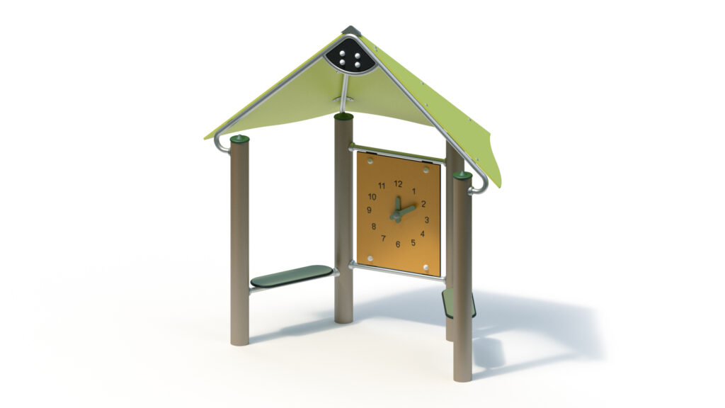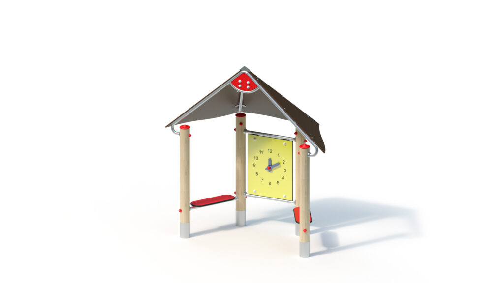 – Plattenbrüstung aus farbiger, höchst witterungsbeständiger HPL-Schichtstoffplatte (rot und gelb). Befestigung zwischen Edelstahlrohren Ø 33,7 x 2 mm. Frontplatte mit Uhr, Zeiger aus HPL-Schichtstoffplatte, blau, zum manuellen Einstellen der Uhrzeit.