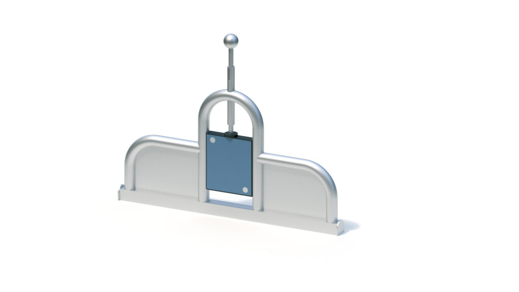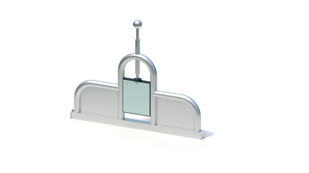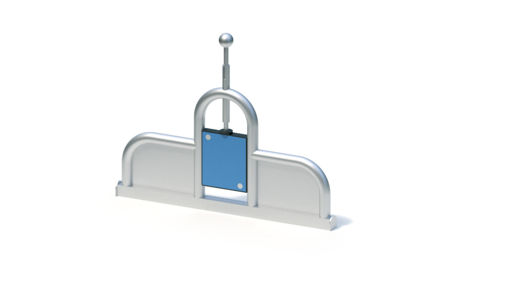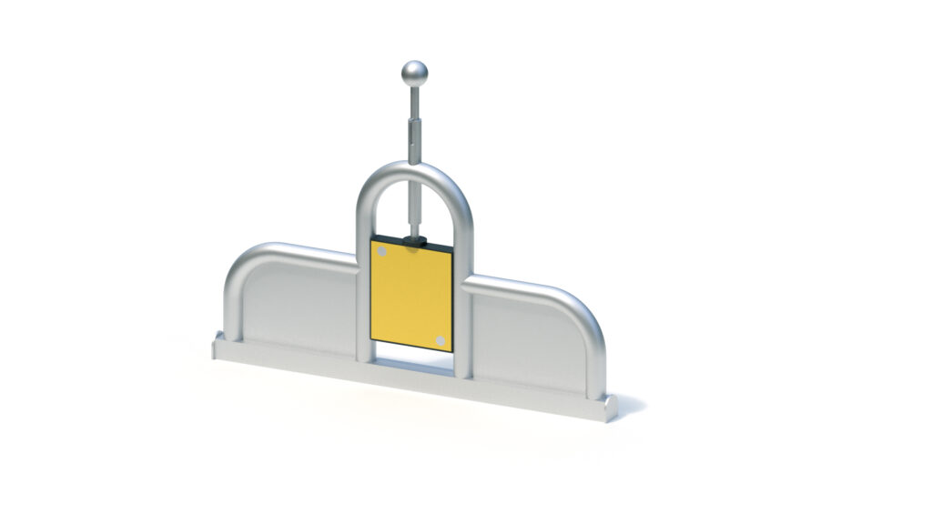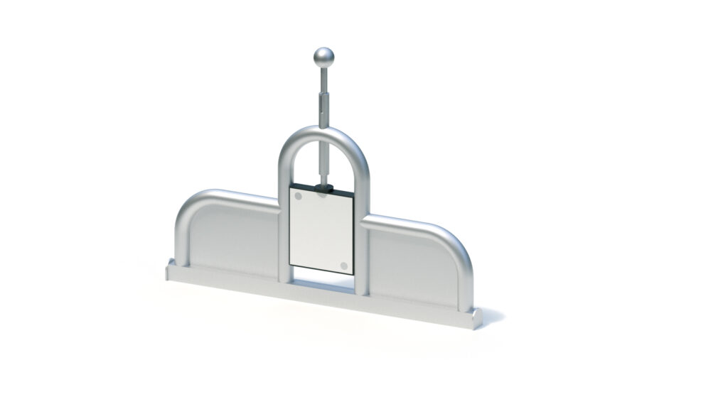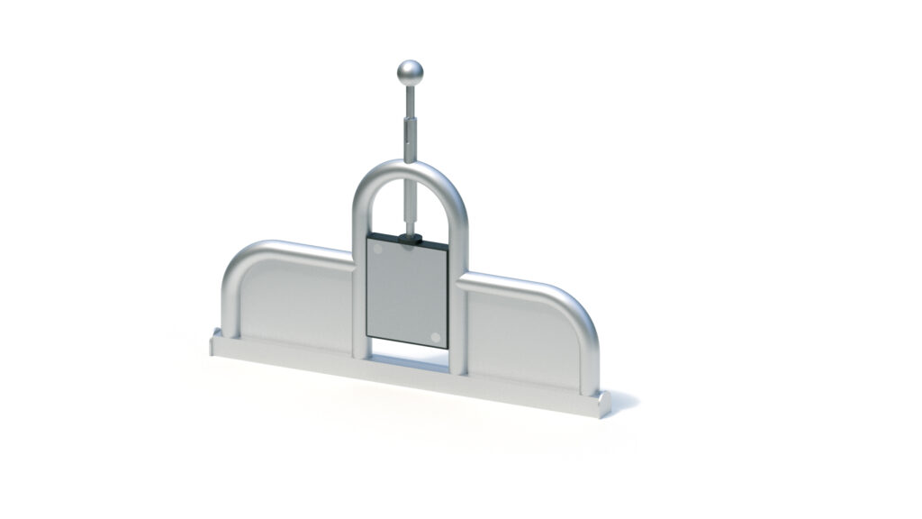 Edelstahlkonstruktion mit höhenverstellbarer Absperrung zum Stauen von Wasser.