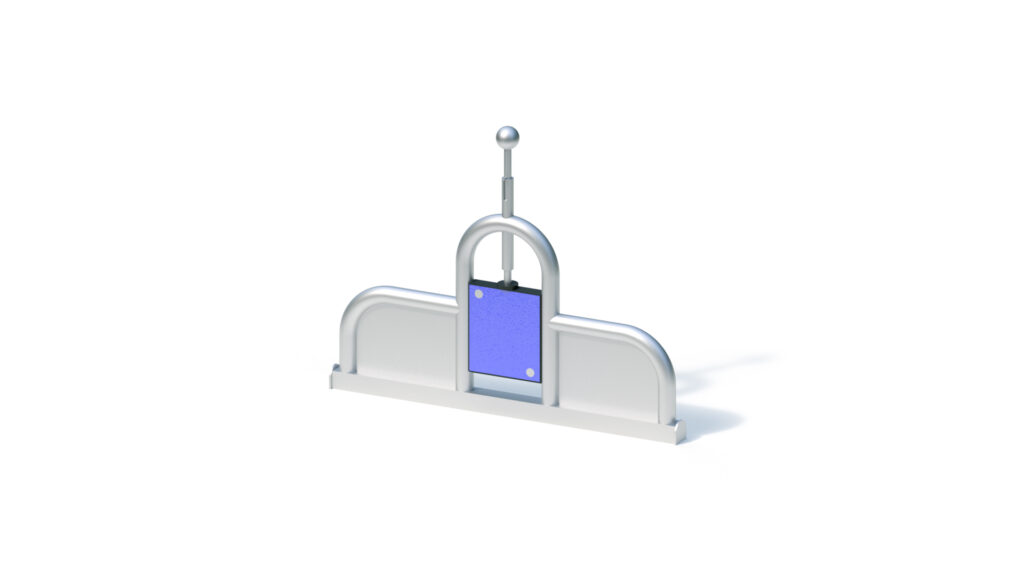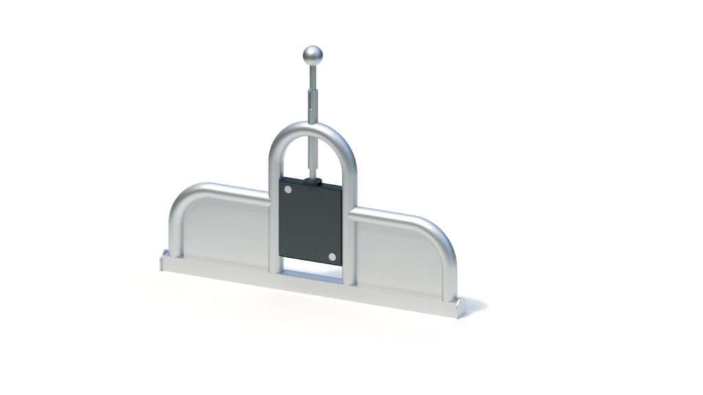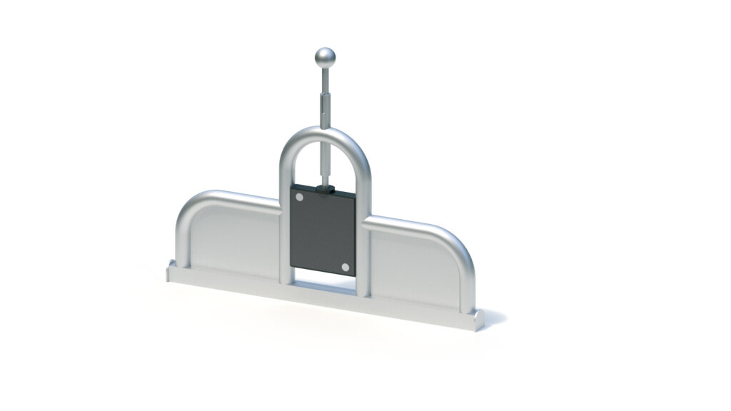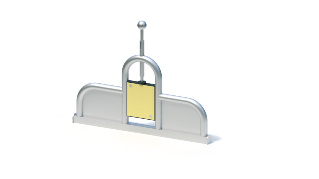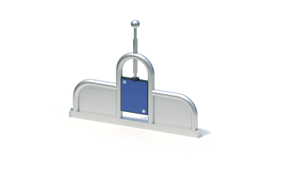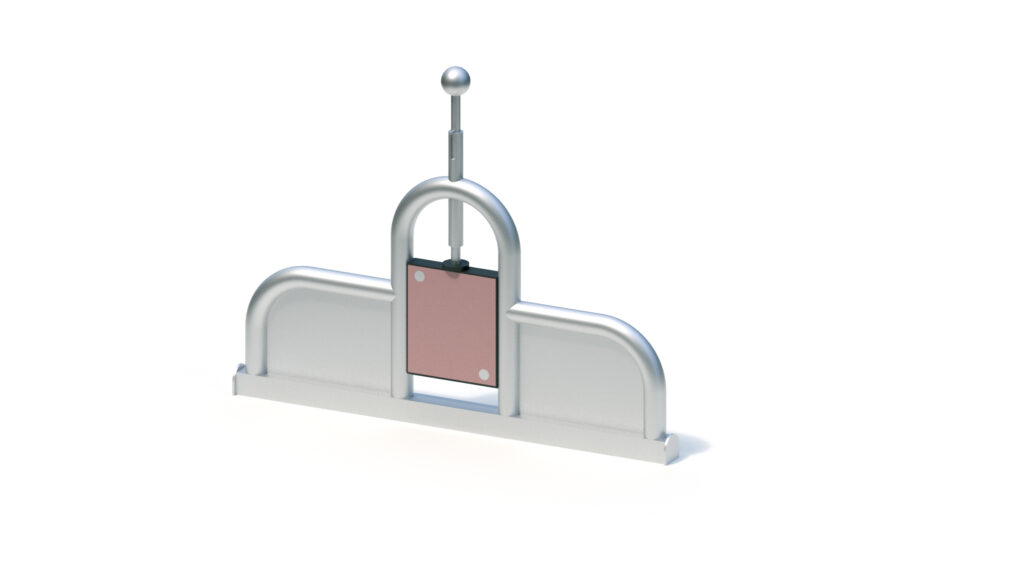 Edelstahlkonstruktion mit höhenverstellbarer Absperrung zum Stauen von Wasser.