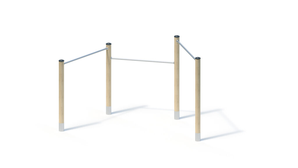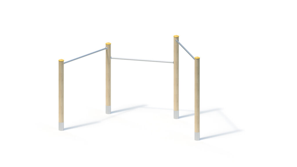 Standpfosten aus Robinienschichtholz, zylindrisch gefräst, Ø 120 mm. Ungeschützte Hirnholzflächen sind mit nicht lösbaren Pfostenkappen aus Edelstahl abgedeckt.