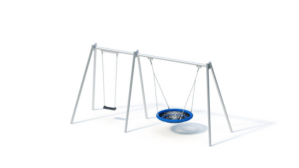 – Swing support posts from hot-dip galvanised steel Ø 76,1 mm, wall thickness 2,9 mm; attachment to swing crossbeam by means of connector plates