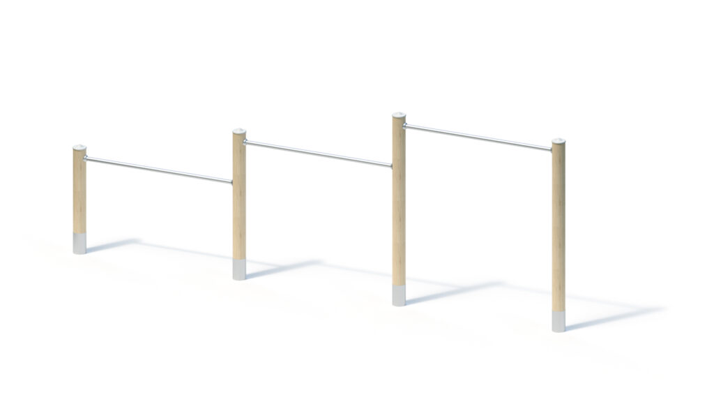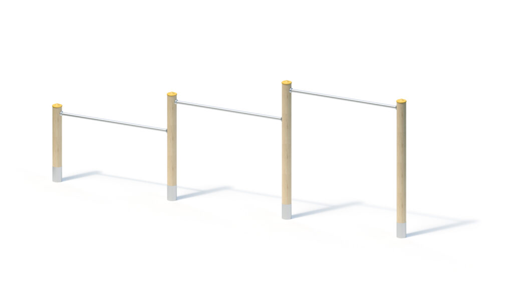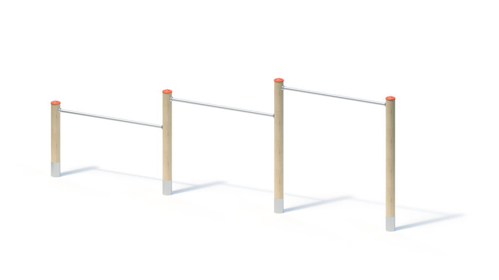Laminated Robinia timber Ø 120 mm with cylindrical milling. End-grain surfaces are covered by non-detachable protective stainless steel caps. Stainless steel tubular pedestal for concrete-cast foundation and for fixed mounting to round Robinia posts, Ø 120 mm, below playing surface.