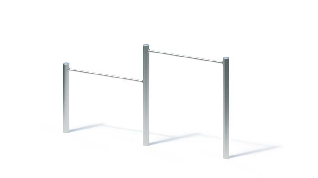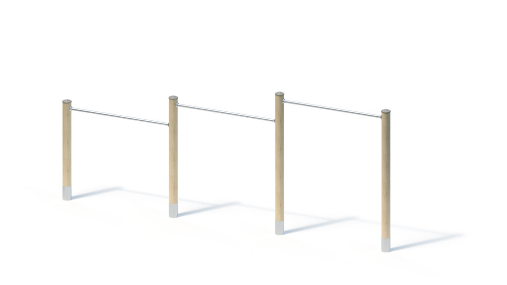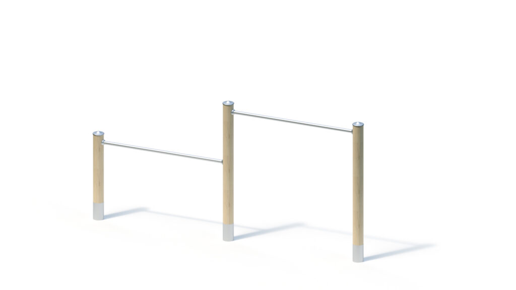 Laminated Robinia timber Ø 120 mm with cylindrical milling. End-grain surfaces are covered by non-detachable protective stainless steel caps. Stainless steel tubular pedestal for concrete-cast foundation and for fixed mounting to round Robinia posts, Ø 120 mm, below playing surface.