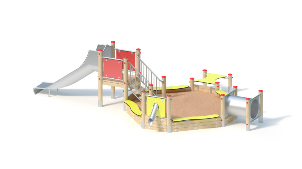 – Sandaufzug mit Transportbehälter aus Gummi und einer 4 mm Edelstahlkette, als umlaufendes Element ausgeführt, damit der Transportbehälter nicht in benachbarte Spielbereiche oder Freiräume gezogen werden kann