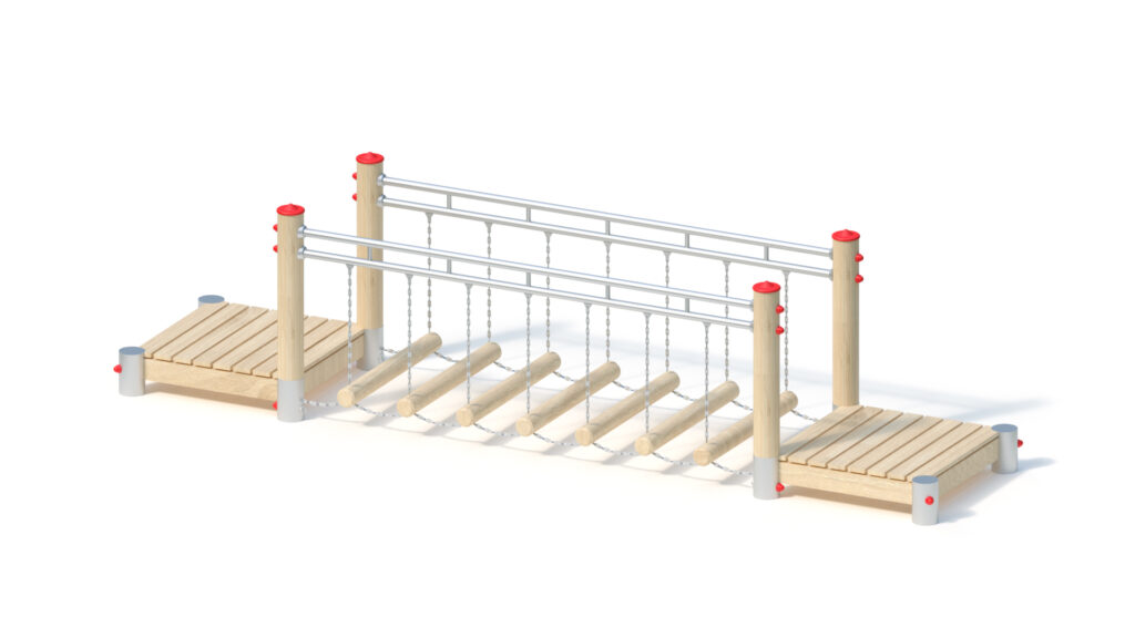 – Wackelbrücke an Tandemtraverse, Laufhölzer aus Robinie Ø 100 mm. Feingliedrige Geländerketten aus Edelstahl.