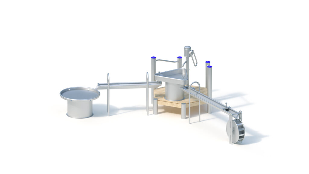 Welded stainless steel construction with additional trough support. Sheet metal thickness: at least 2 mm. Inclined run-off, including flexible flap with stainless steel knob and reinforced rubber blade, clamping device for tube attachment Ø 38 mm. Water wheel consisting of 12 paddle wheels, rounded on the front end, framed by side panels. Water wheel mounted to roller bearing.