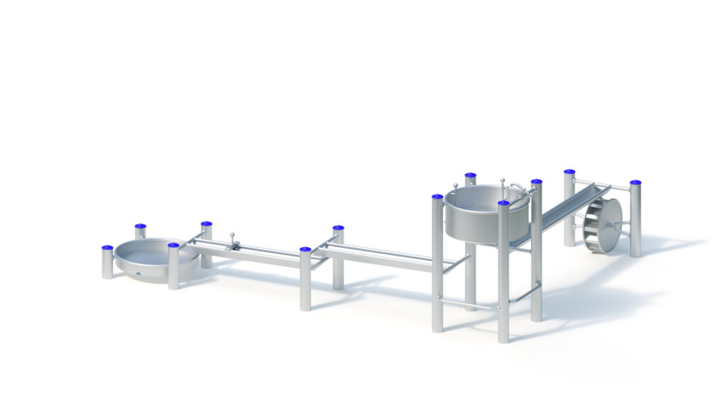 Welded stainless steel construction for post attachment, for water collection from a trough on top, 12 paddle wheels, rounded on the front end, framed by side panels. Sheet metal thickness: 2 mm at least. Water wheel mounted in roller bearing.