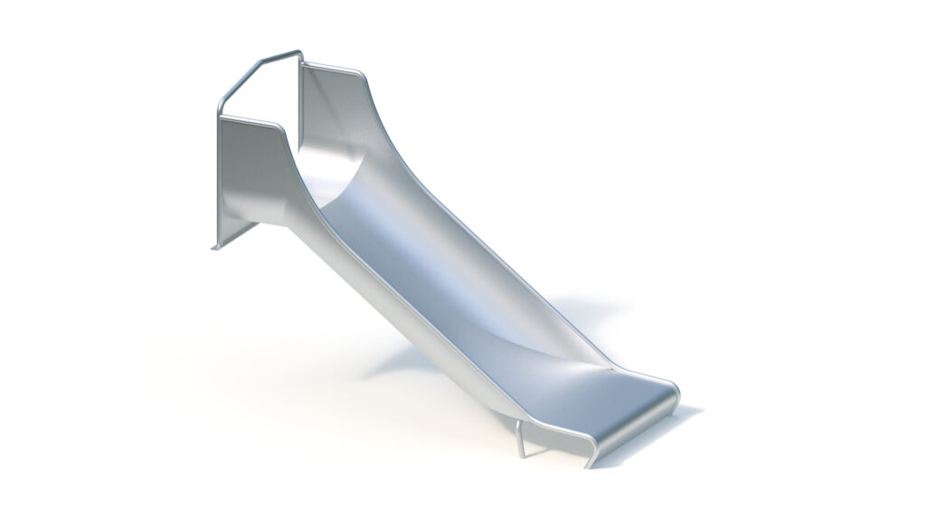 One-piece stainless steel structure with additional support for slide run-out section. Slide of low noise level thanks to trough-shaping. Slide installation either on a strip footing or another appropriate surface (wooden platform or planking) to be determined on site. Please see to appropriate ground surfacing by means of e.g. a wooden platform or plank or a concrete strip-footing.